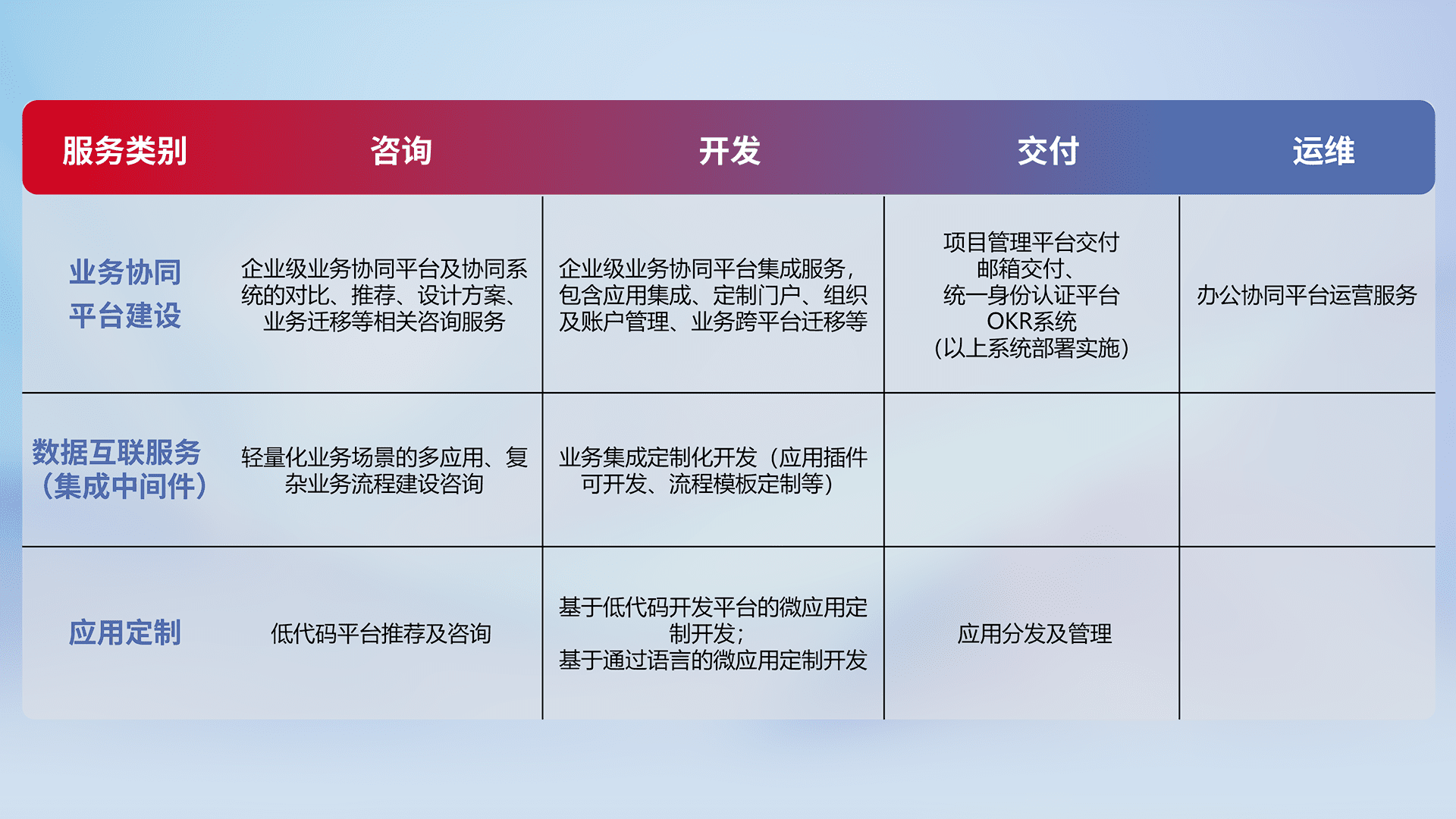 针对钉钉、、、、企微、、、IDaas等平台级产品提供产品的规划、、方案、、、、交付、、、、定制化开发等服务,,实现如统一协同办公、、、、智能客户服务、、混合会议管理、、智能数据查询、、、等业务场景,,实现数字化转型。。。。