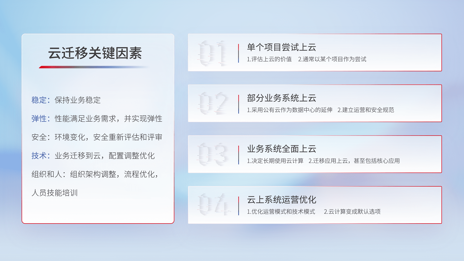 结合实际业务,,从规划设计、、、、云平台选型、、、云原生改造、、数据迁移、、、、集成交付,,,,迁移全过程为客户识别最佳上云路径,,,,做好风险识别管理,,,,设计网络架构、、、、身份权限、、安全审计合规、、、操作审计、、日志审计、、、、监控告警策略、、多站点容灾设计等,,,对云上基础设施进行整体规划,,,,提升IT治理水平,,,,以满足弹性、、、、高可用、、、、高性能的需求。。。