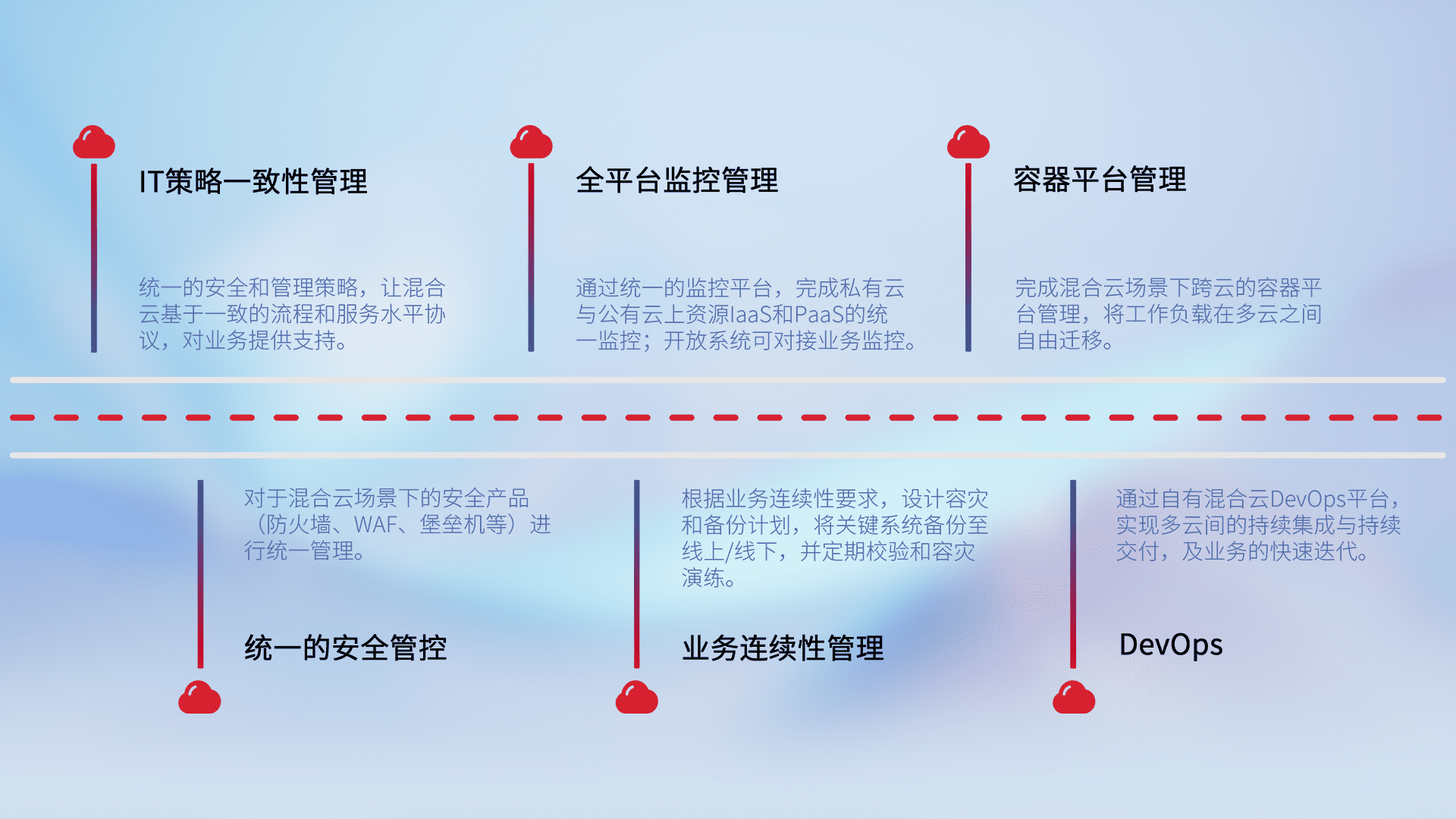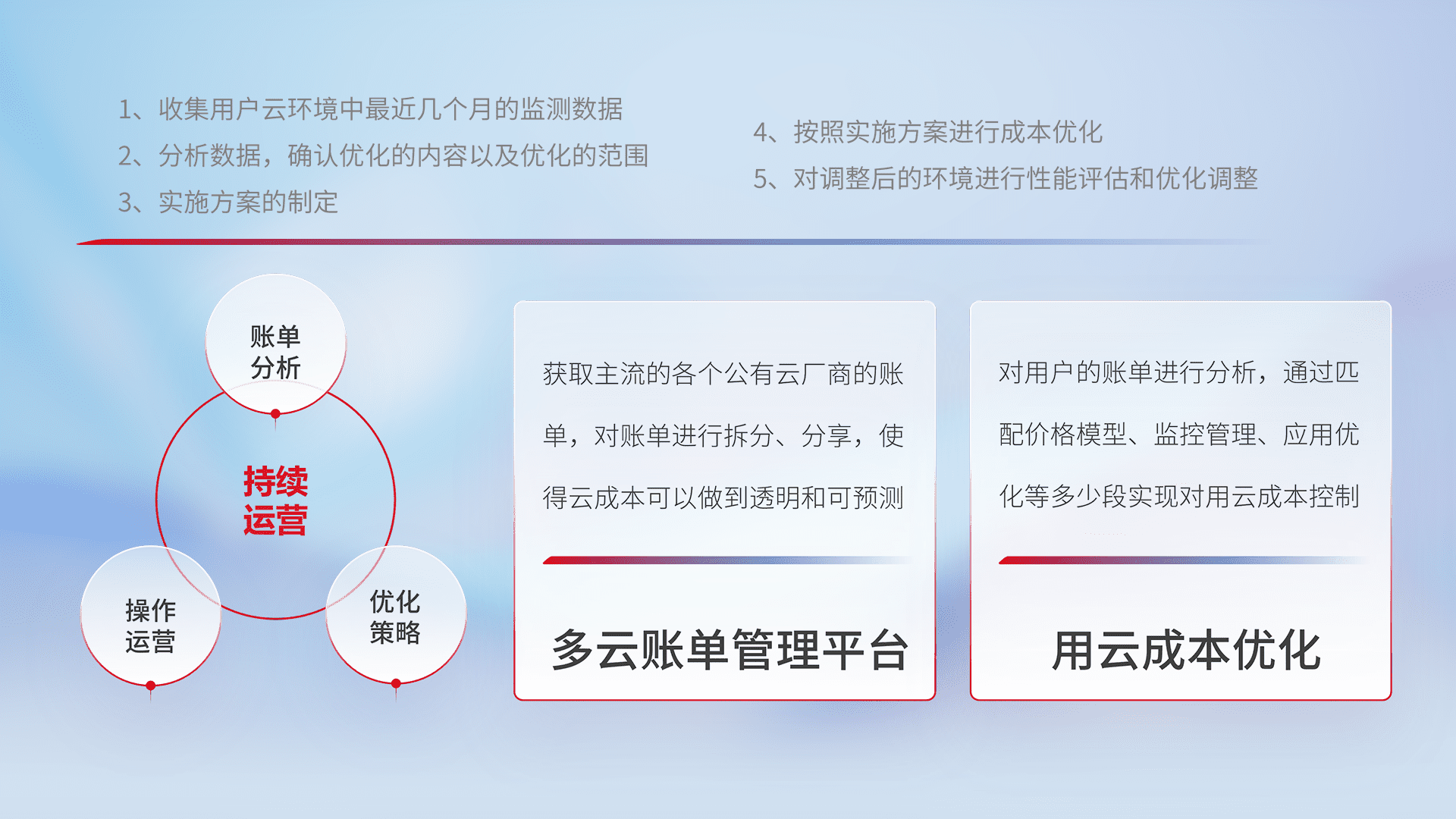 通过多云纳管,,以统一的资源数据模型把客户的云资源进行抽象和封装,,,进而实现对多云资源的统一操作,,,保障云资源管理的可靠性、、稳定性与可用性。。量身定制化运维内容,,配置、、开发运维、、、补丁管理、、、备份、、、、监控、、认证和访问管理、、、、审计和日常巡检等,,,,保障在用云过程中的可靠度,,稳定度以及高可用率。。